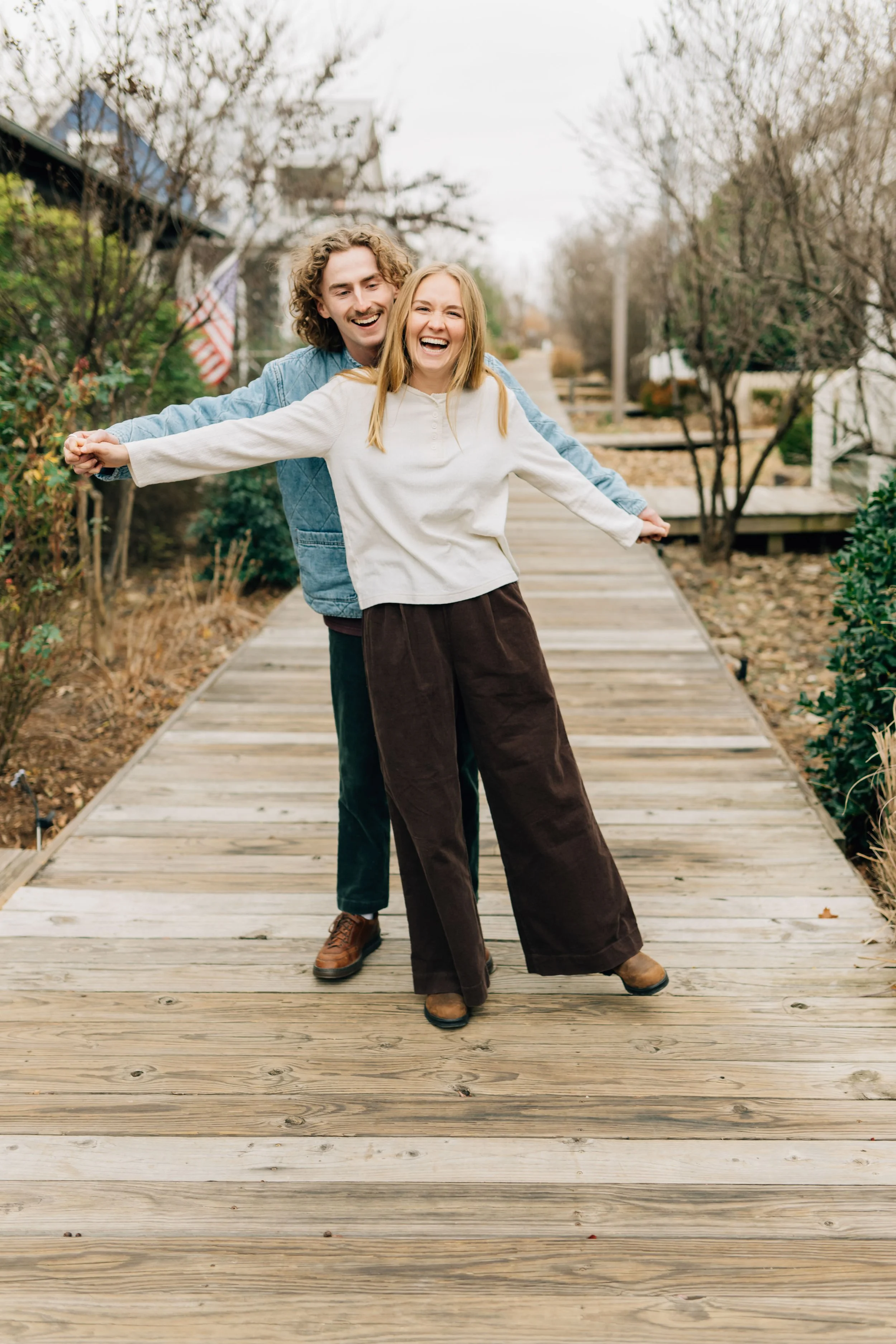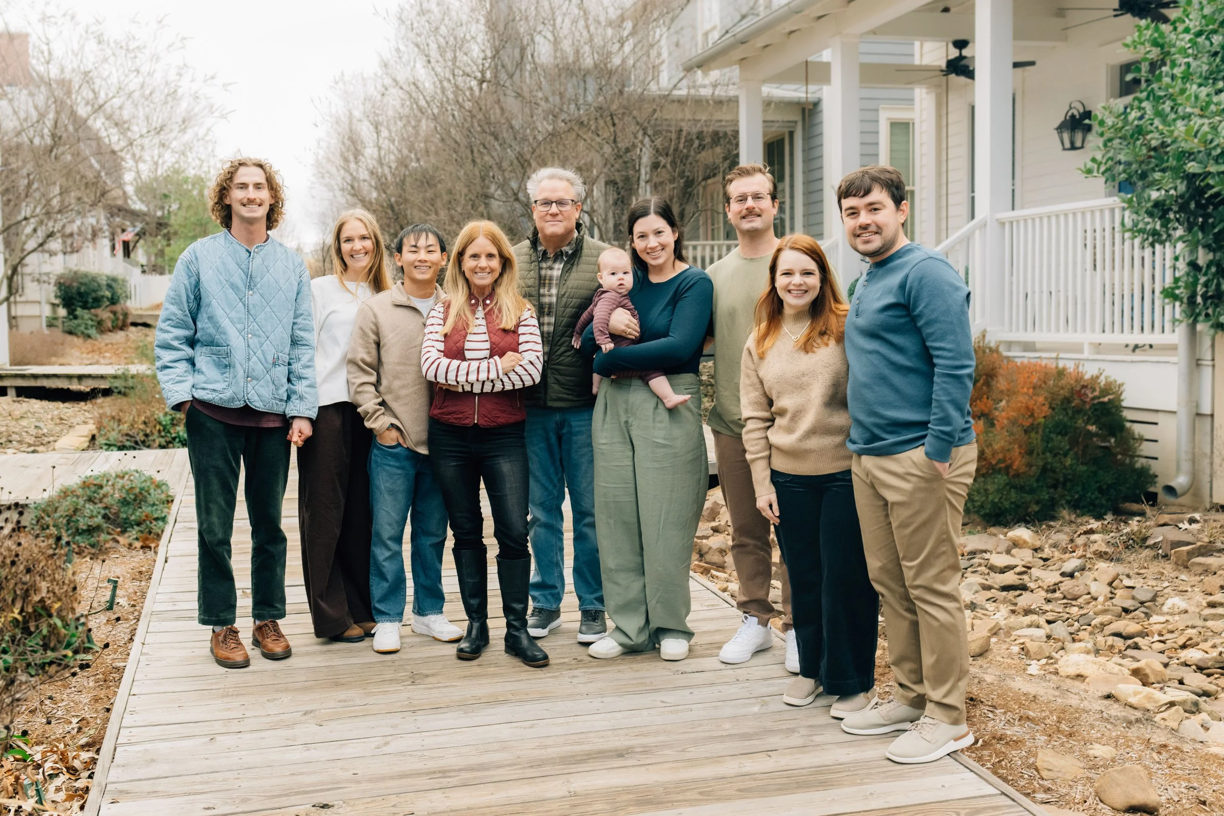 Winter at Carlton Landing has a calm, slow energy that is hard to beat. The community itself offers so many beautiful backdrops for family photos without ever feeling rushed or busy. Boardwalk walks with the whole family, lake views with rocking chairs right along the water, and little tucked away nooks of stunning architecture make it incredibly versatile for extended family photography. And can we talk about the vines climbing the buildings in the winter? So good. The texture, the character, the charm. It photographs beautifully.